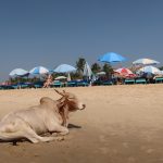 –Fiquei na praia de Kalangute e de imediata se percebe quais os principais grupos de turistas. Primeiro os Russos , seguidos dos alemães e Britânicos. Porque aqui é sempre verão, exceto na época de chuvas e é barato para as moedas europeias. Na praia, o mais surreal , já não tanto depois de mais de vinte dias na Índia, são as vacas, na praia. Ali, sentadas, de pé, ruminando , transmitem um calma. Estão em estado zen, meditando e não dão nem bola para as selfies e fotos dos turistas.