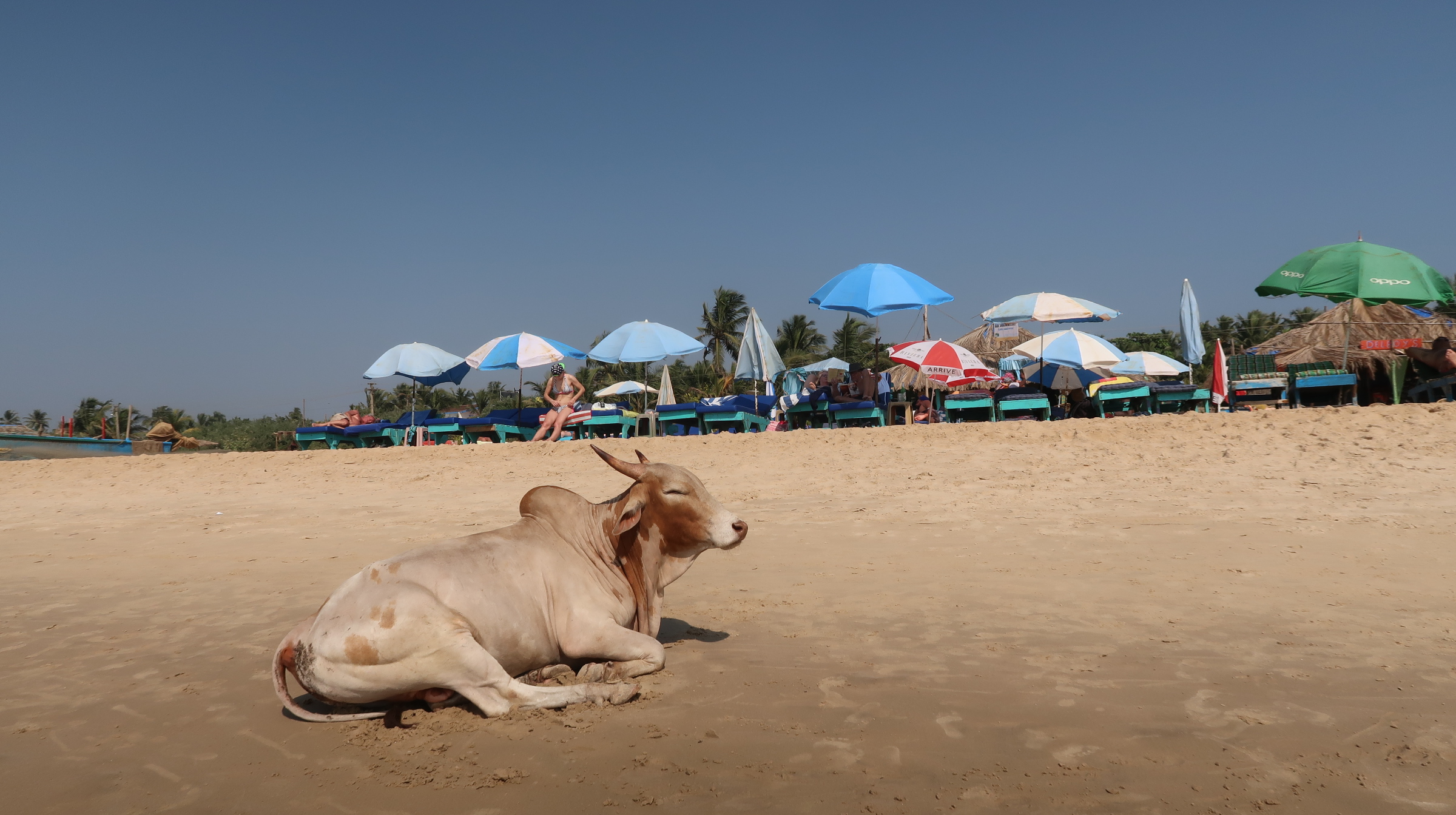 –Fiquei na praia de Kalangute e de imediata se percebe quais os principais grupos de turistas. Primeiro os Russos , seguidos dos alemães e Britânicos. Porque aqui é sempre verão, exceto na época de chuvas e é barato para as moedas europeias. Na praia, o mais surreal , já não tanto depois de mais de vinte dias na Índia, são as vacas, na praia. Ali, sentadas, de pé, ruminando , transmitem um calma. Estão em estado zen, meditando e não dão nem bola para as selfies e fotos dos turistas.